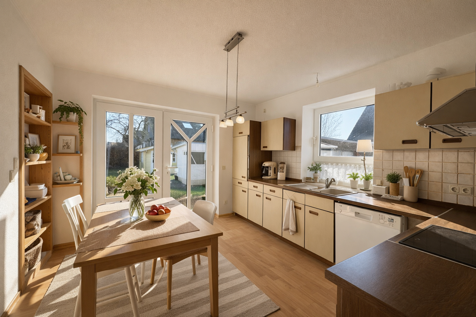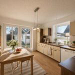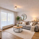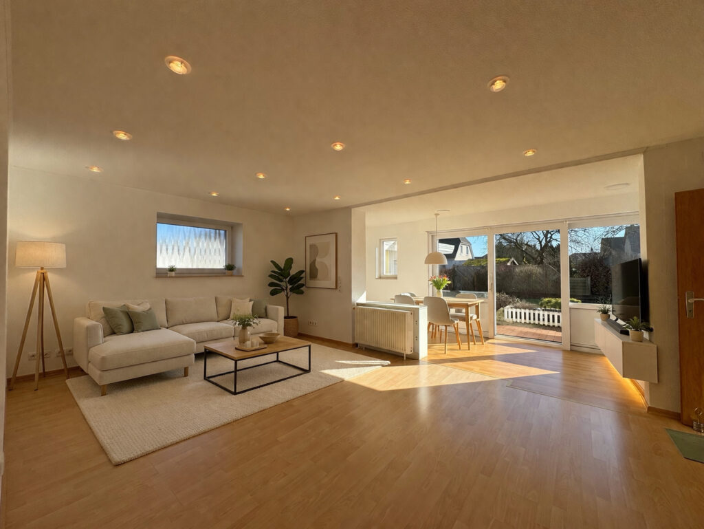Das Erdgeschoss überzeugt durch ein modernes Raumgefühl. Herzstück ist das großzügige Wohnzimmer mit später ergänztem Anbau. Große Fensterflächen eröffnen den Blick in den Garten und schaffen eine helle, freundliche Wohnatmosphäre. Von hier aus besteht direkter Zugang zur Terrasse und ins gepflegte Grundstück.